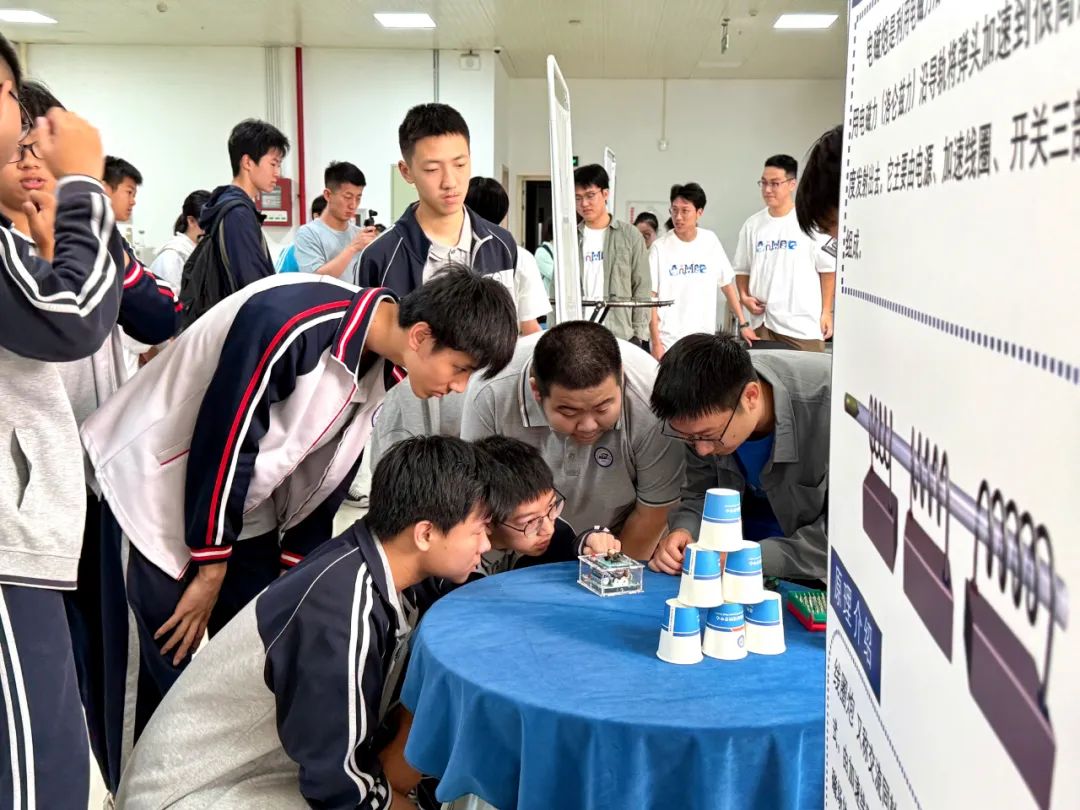 在“电磁炮模型科普”展台,同学们屏息凝神专注调整发射角度,感受电磁弹射的力量,一旁的强磁场中心博士生蔡梦豪为同学们耐心讲解实验原理。