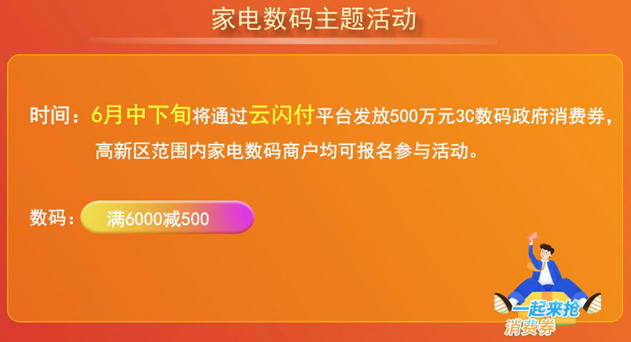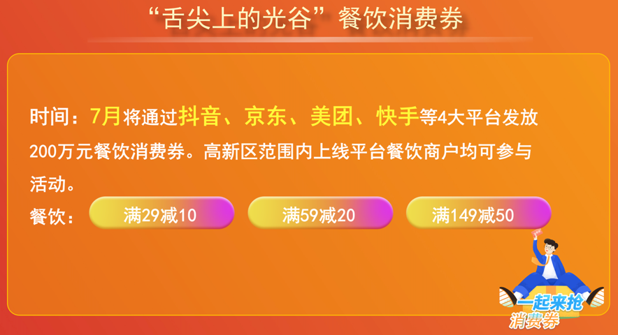餐饮领域,围绕暑期夜经济主题,高新区将通过抖音、快手等平台发放200万元餐饮消费券,最高可享满149减50的梯度优惠,高新区内已上线平台的餐饮商户均参与其中,具体细则和内容将于7月发布。