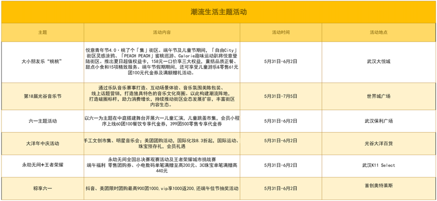 各大商圈纷纷拿出“看家本领”:武汉大悦城“悦意青年节4.0”焕新升级,街区灵感涂鸦、趣味运动挑战等互动体验,为消费者带来新奇有趣潮流玩法;武汉K11“夏季臻选季”推出零售、小家电团购福利,更有王者荣耀城市挑战赛,打造高水准观赛体验。