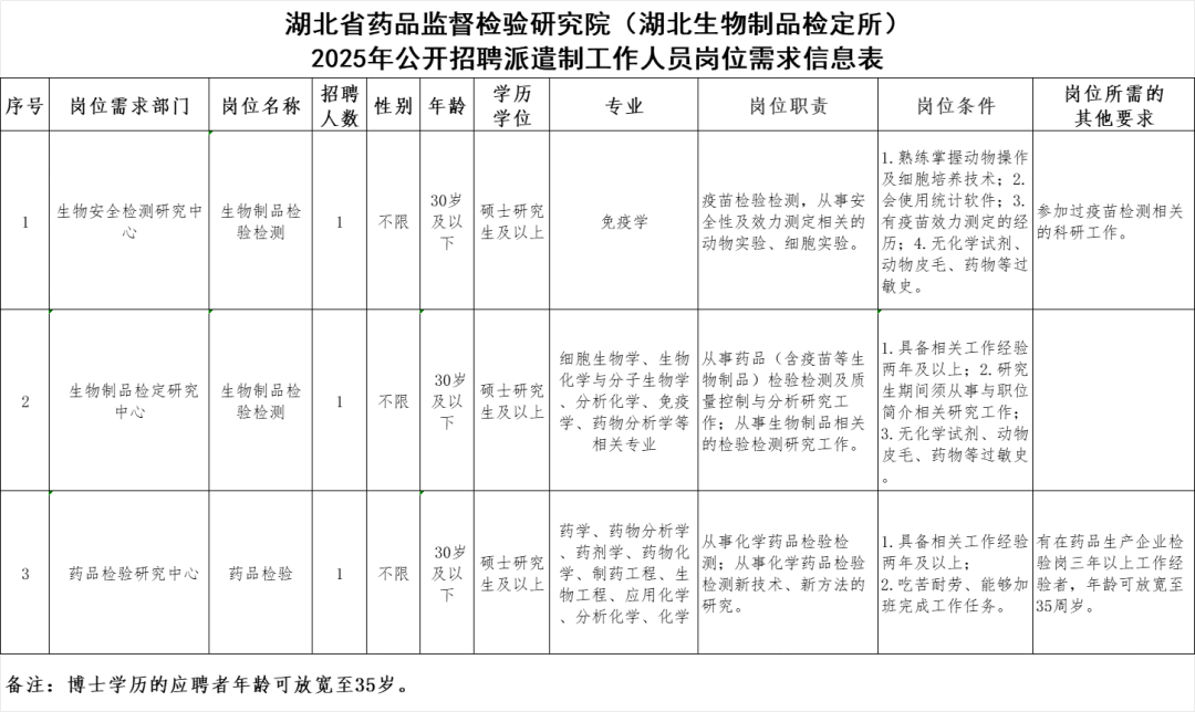 2025年我院拟计划公开招聘派遣制工作人员3名,其中生物制品检验检测岗位2名,药品检验岗位1名。