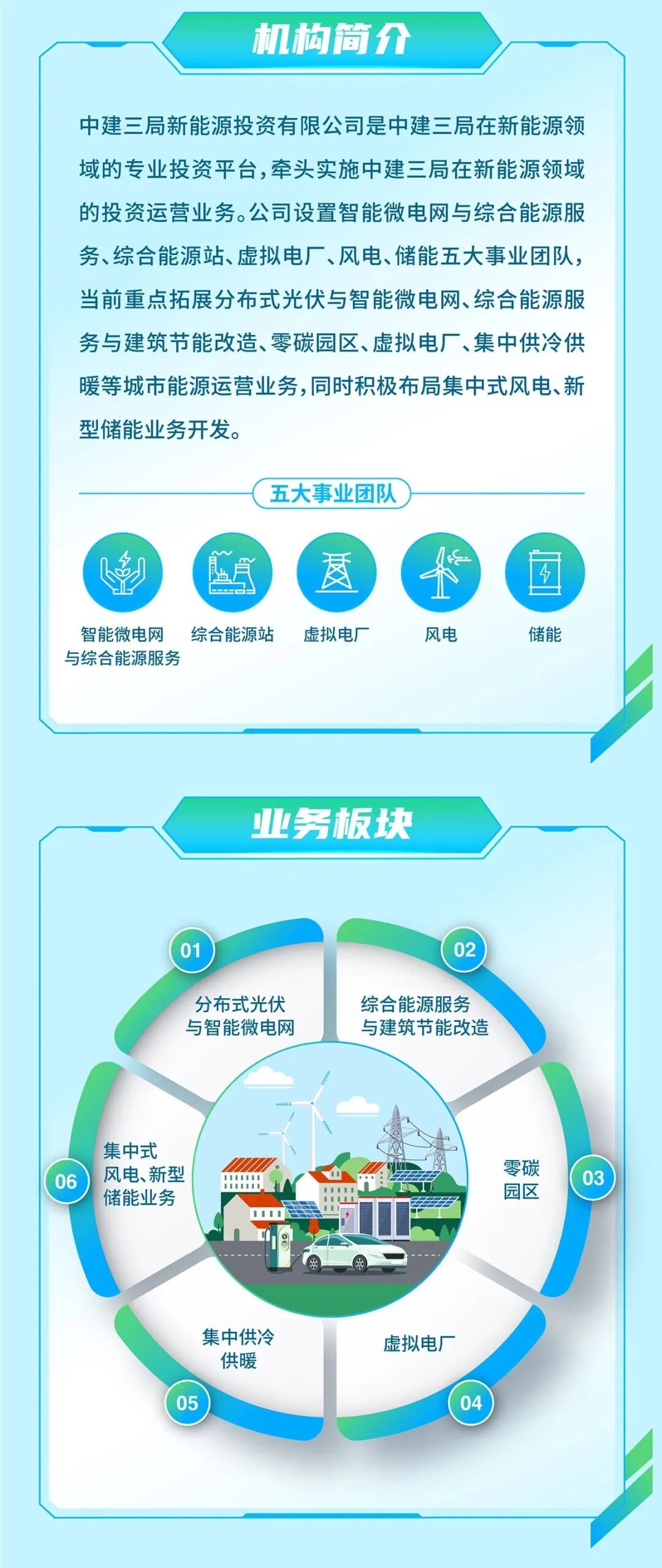 中建三局新能源投资有限公司是中建三局在新能源领域的专业投资平台,牵头实施中建三局在新能源领域的投资运营业务。公司设置智能微电网与综合能源服务、综合能源站、虚拟电厂、风电、储能五大事业团队,当前重点拓展分布式光伏与智能微电网、综合能源服务与建筑节能改造、零碳园区、虚拟电厂、集中供冷供暖等城市能源运营业务,同时积极布局集中式风电、新型储能业务开发。
