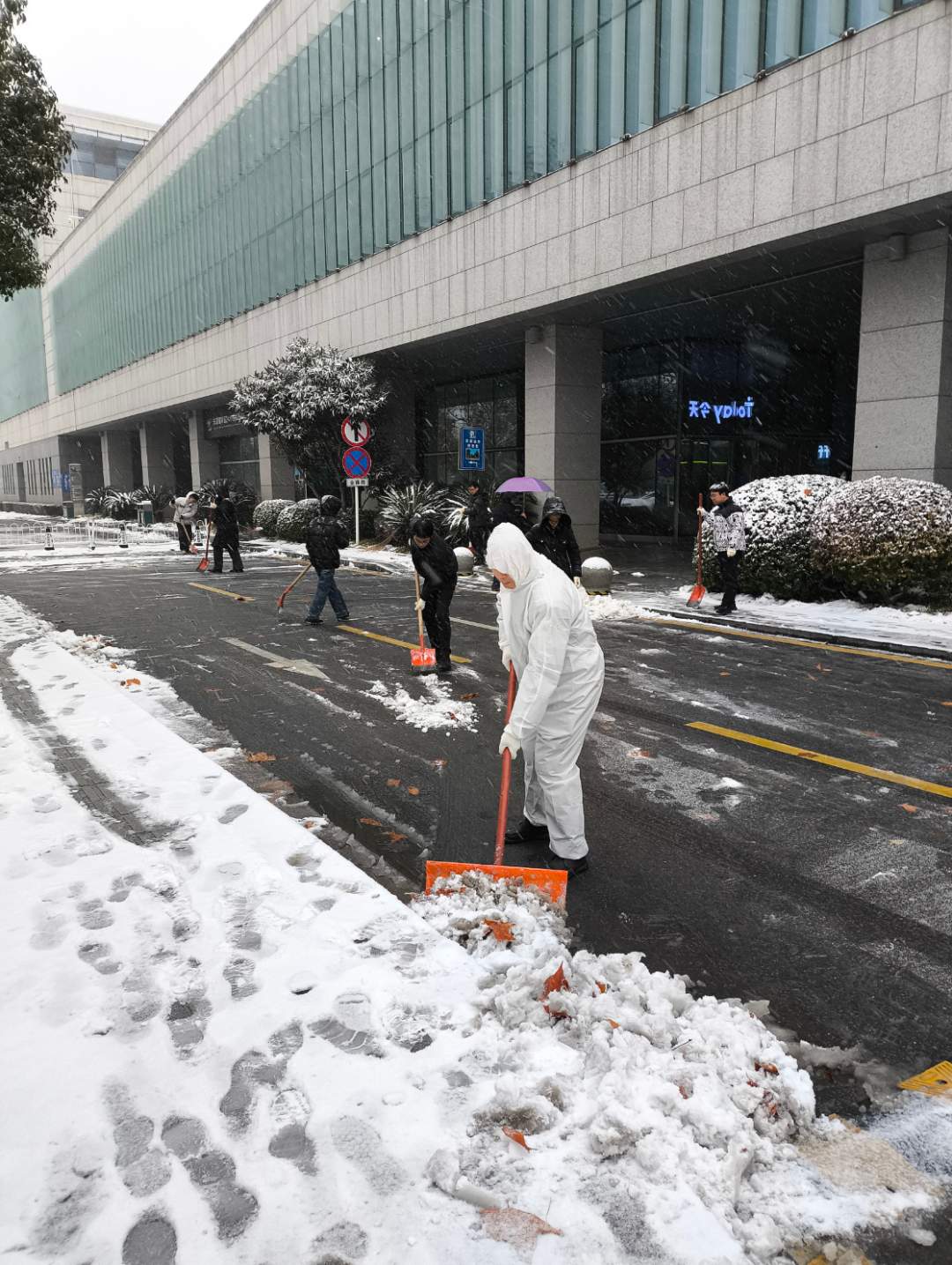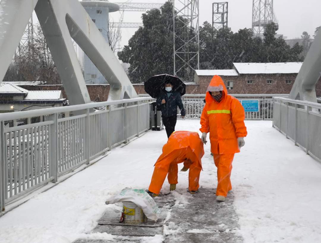 东湖高新区公共服务中心,工作人员正在铲雪
