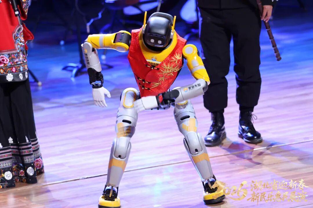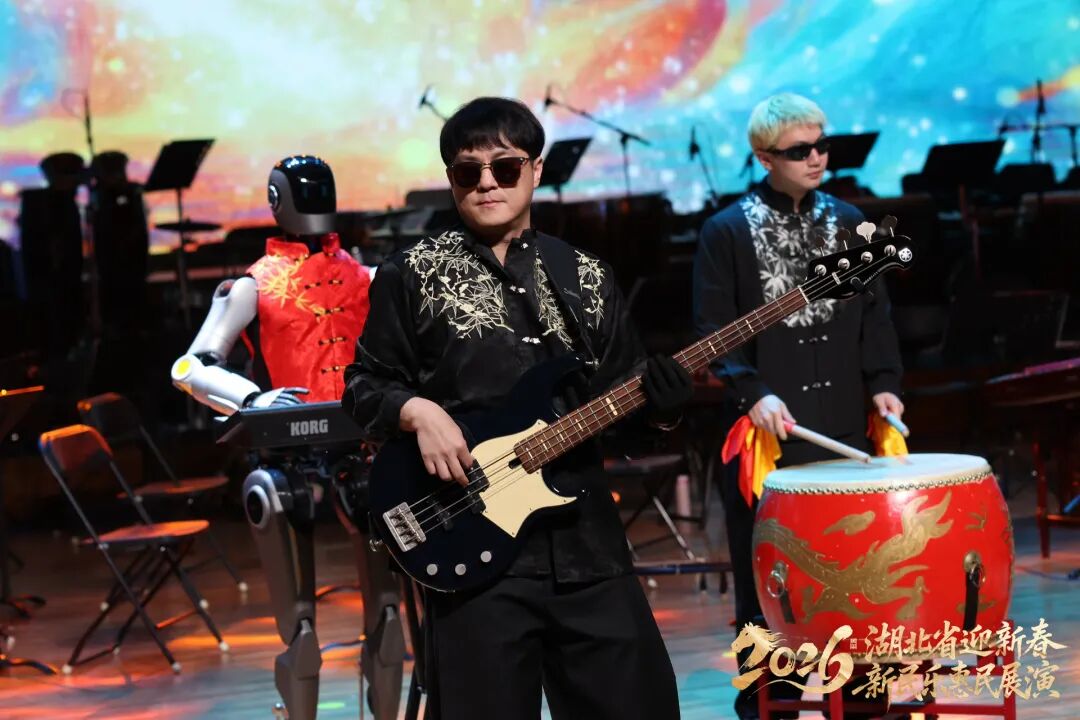 光谷东智研发的“汉产”智能人形机器人也登台演出,一出场就牢牢抓住了观众席的目光。原生态吟唱、电子编曲与机器人程序响应相辅相成,诠释出充满未来感的国乐新声。退场时,机器人的比心、飞吻等动作,更是令观众们忍俊不禁。