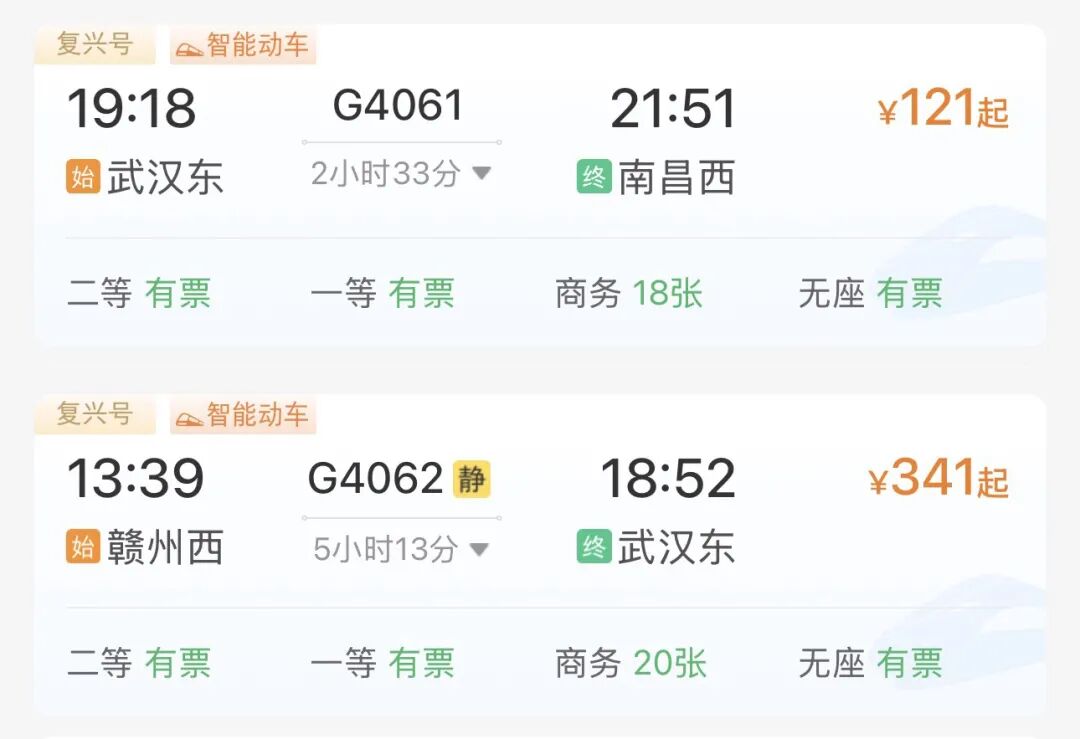 铁路12306App显示,G4061次列车(武汉东-南昌西)19:18分从武汉东站出发,21:51分抵达南昌西站,全程运行时间约2小时33分钟,途经黄石北、大冶北、阳新、瑞昌西、庐山、共青城、永修等站点。