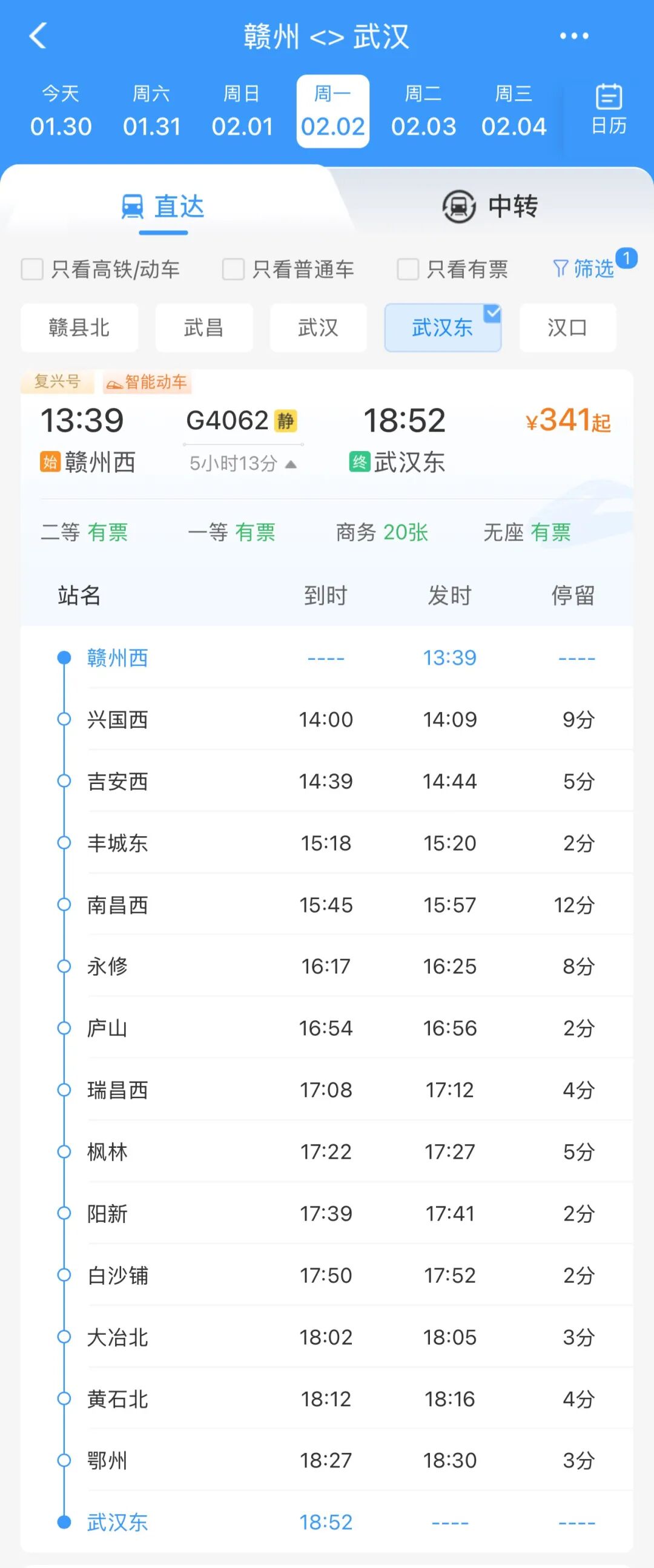 G4062次列车(赣州西-武汉东)13:39分从赣州西发车,18:52到达武汉东站,全程5小时13分,途经兴国西、吉安西、丰城东、南昌西、庐山、瑞昌西、枫林、阳新、白沙铺、大冶北、黄石北、鄂州等地。线路覆盖沿线多座城市,将为旅客提供更加便捷、高效的出行选择。