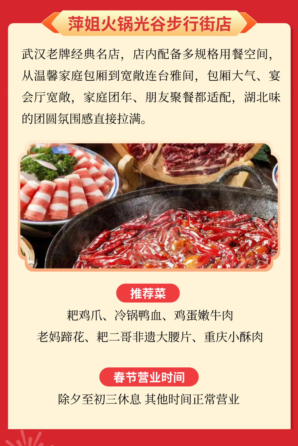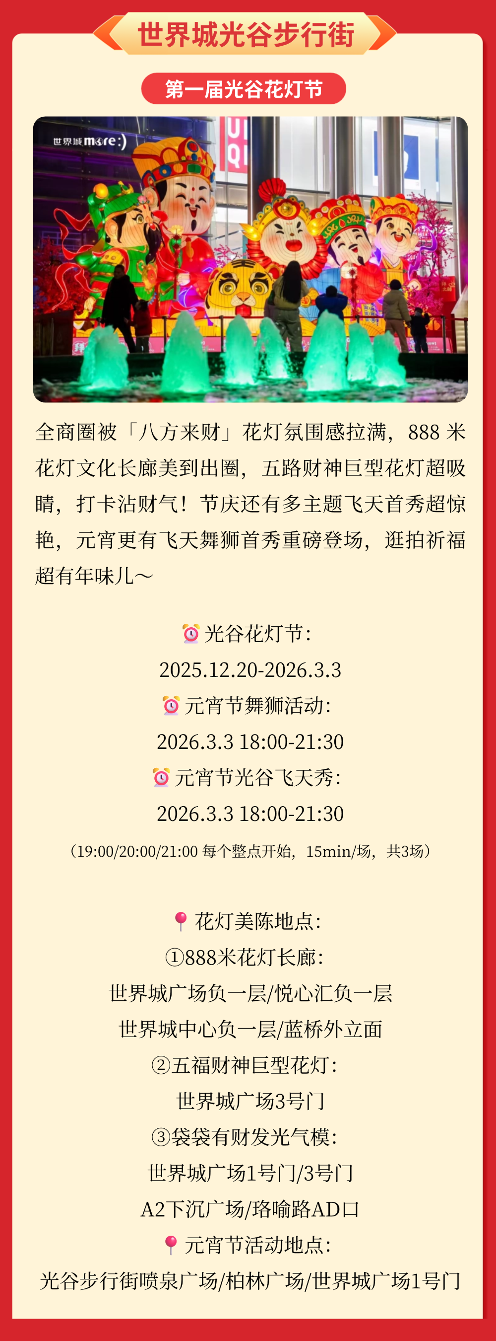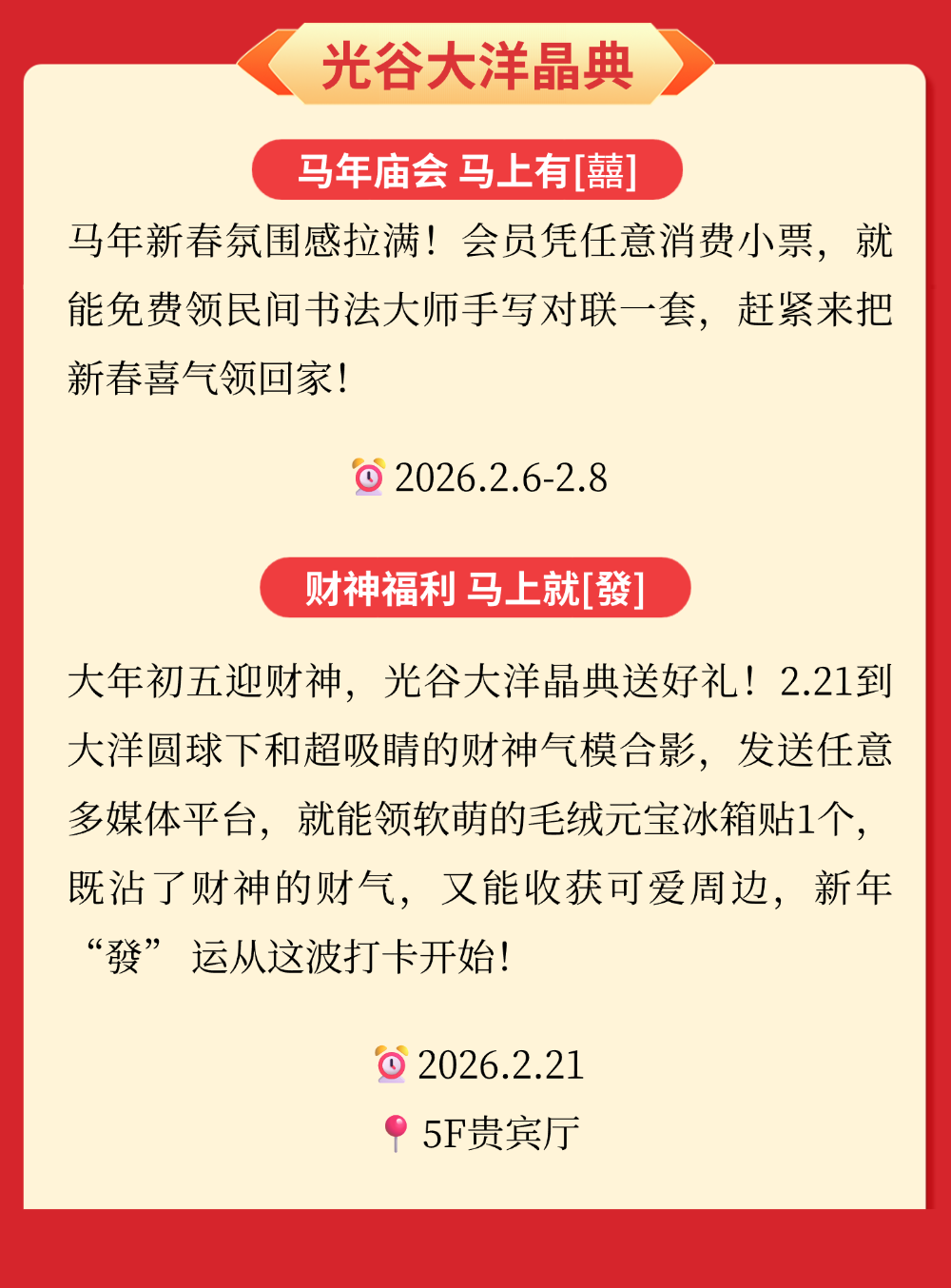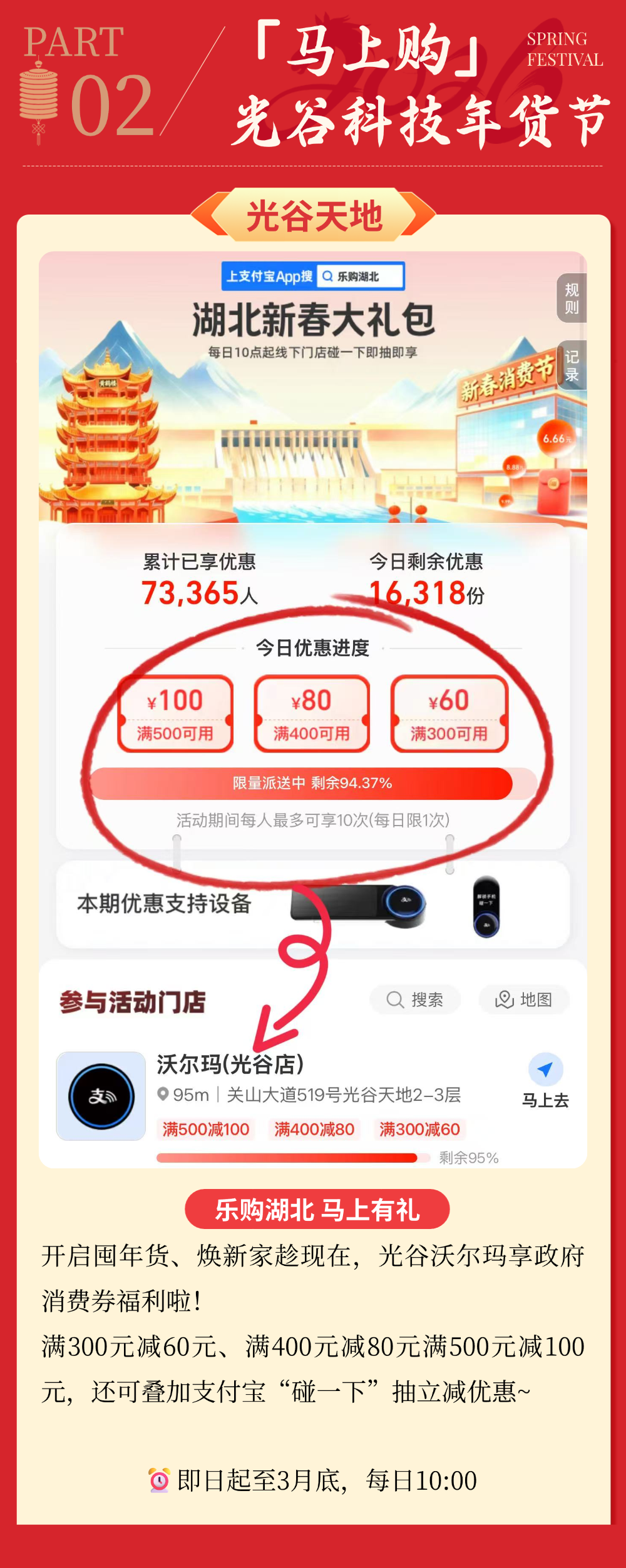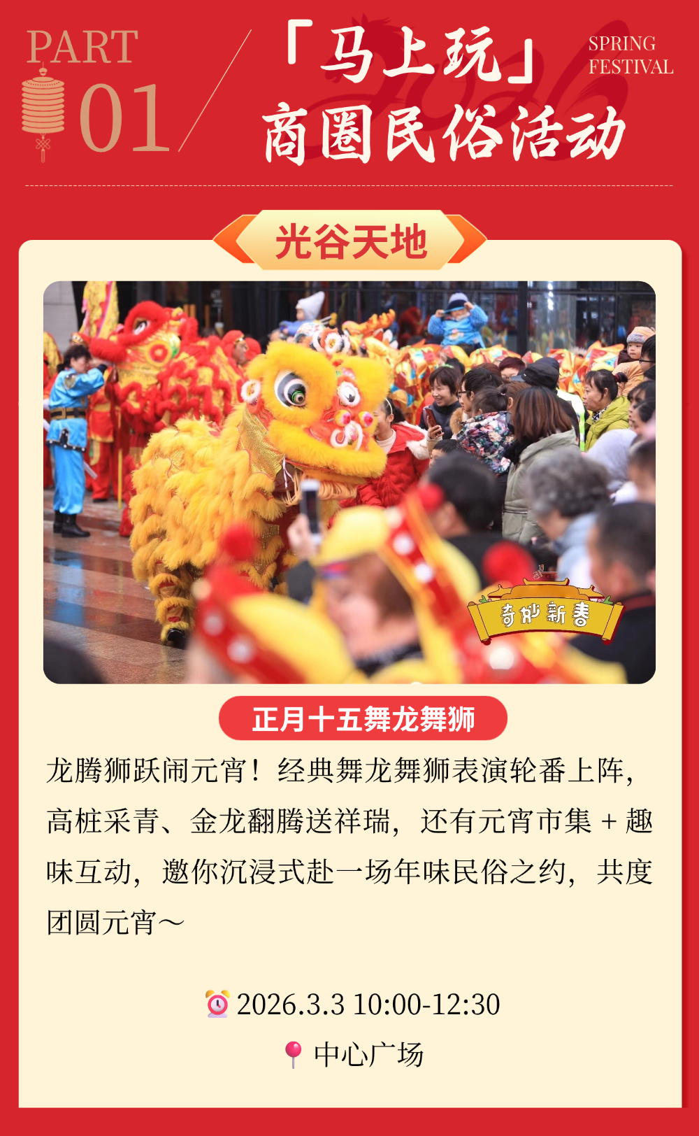 马年春节,光谷开启新春消费季!马上吃、马上玩、马上购→ 2026-02-14 17:22 中国光谷微信公众号 0 马年新春将至, 光谷重磅开启“新春消费季”! “马上吃”春节不打烊, “马上购”科技年货节, “马上玩”商圈新春民俗盛宴, 逛吃玩购,一站式拿捏, 承包你的整个新春快乐!