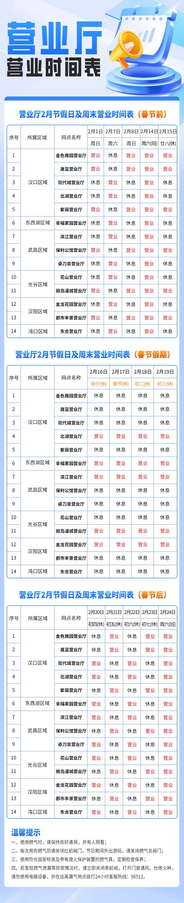 近日,武汉市燃气集团发布2026年春节期间营业厅安排表(详见下图)。