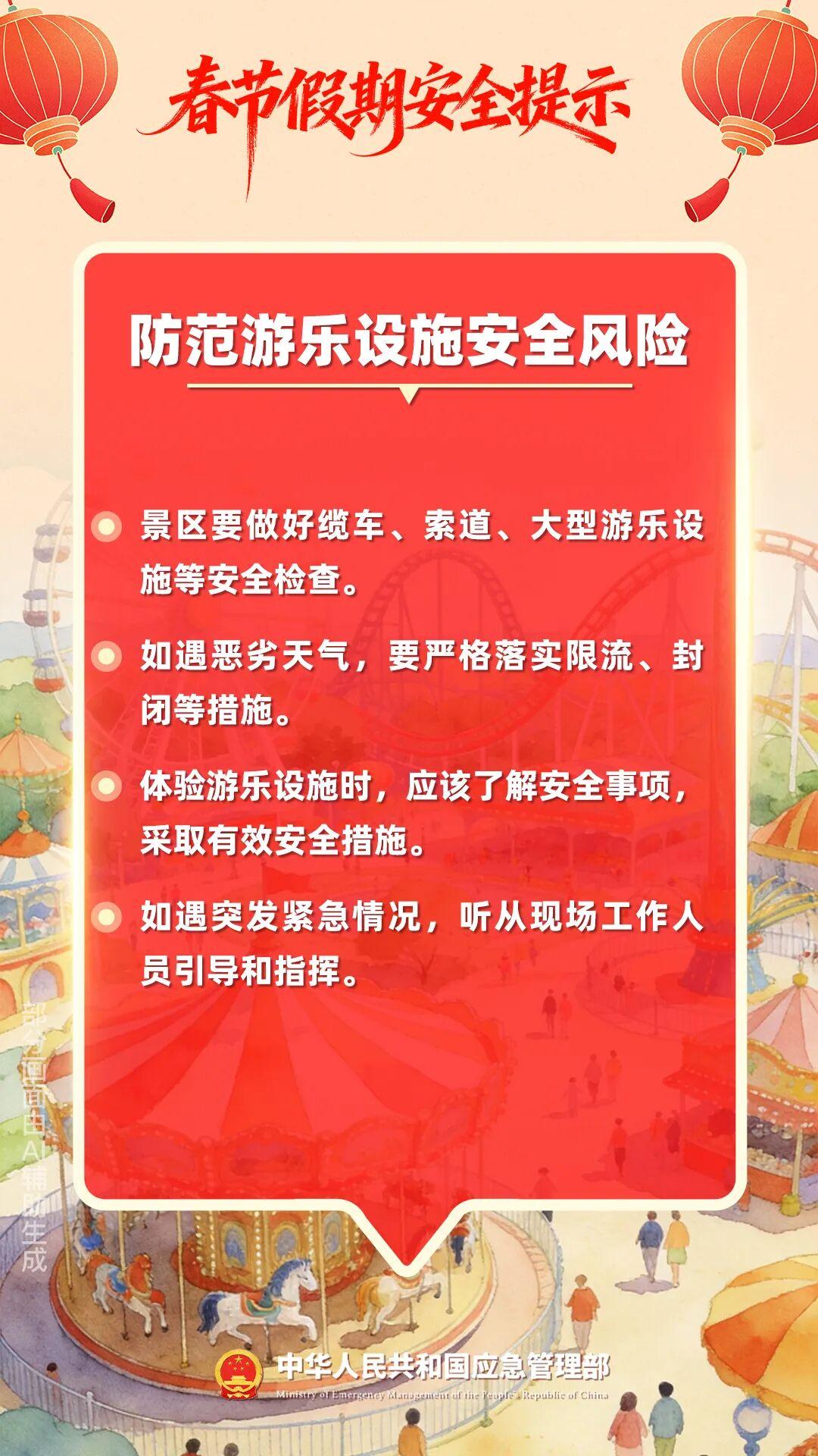春节假期将至,用火用气用电增加,群众出游、自驾出行、客货运输迎来高峰,灯会、庙会、促销庆典等大型活动多,宾馆、饭店、市场、商超等场所人流密集,煤炭、石化等企业保供压力加大,低温雨雪冰冻等恶劣天气多发,各类风险隐患交织叠加,安全生产须臾不可放松这份春节假期安全提示请查收。