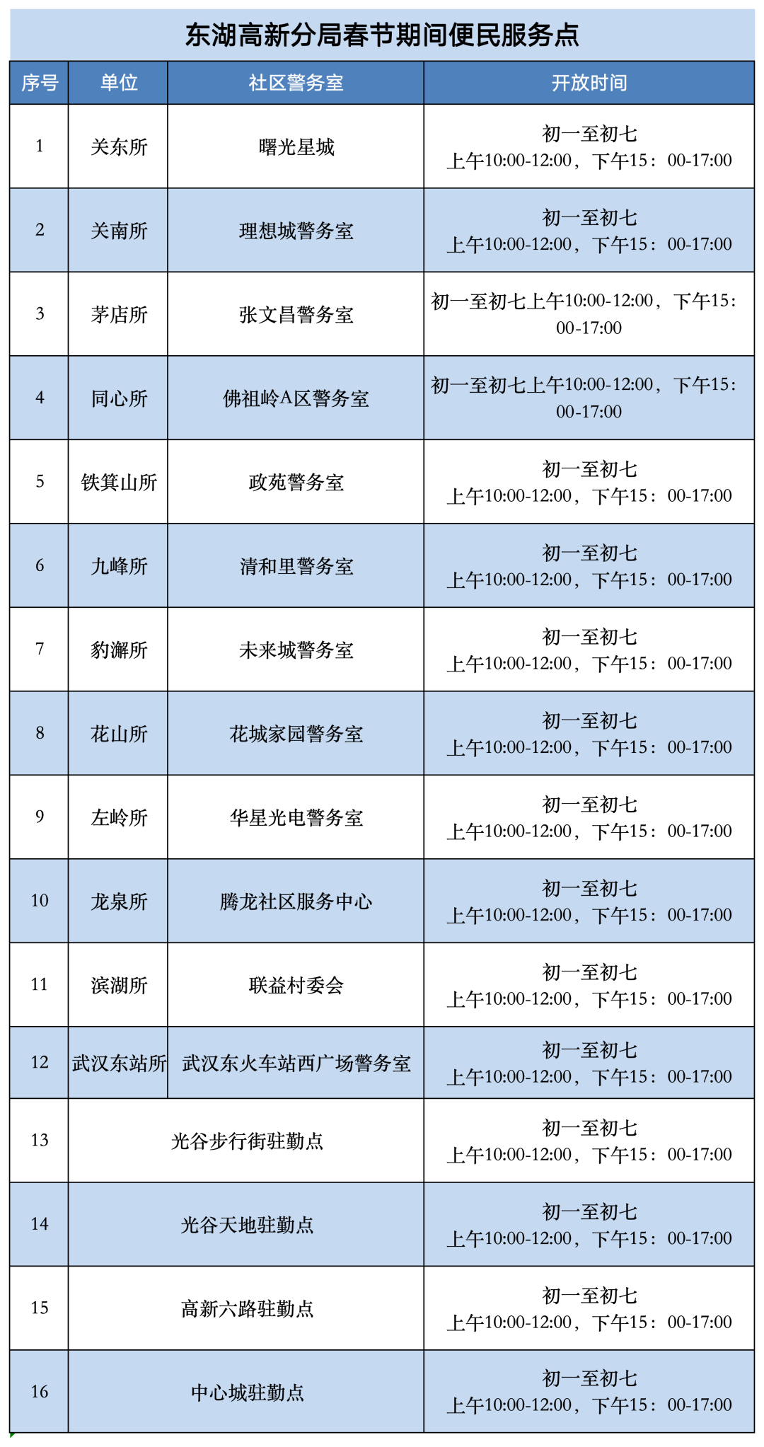 各派出所(正月初一至初七)在辖区大型社区、商圈设置16个便民服务点,接受群众咨询、求助及报警,提供便捷、温馨的服务。