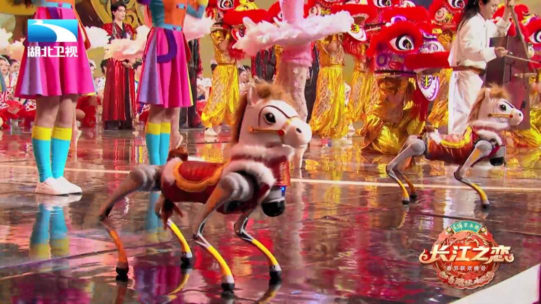 开场,12只身穿小马服的机器狗演绎歌舞《春风万里嘚嘚儿驾》。以灵动俏皮的机械身姿与专业舞者默契配合,将传统生肖意象与前沿机器人技术结合,创造出独特的视觉语言。