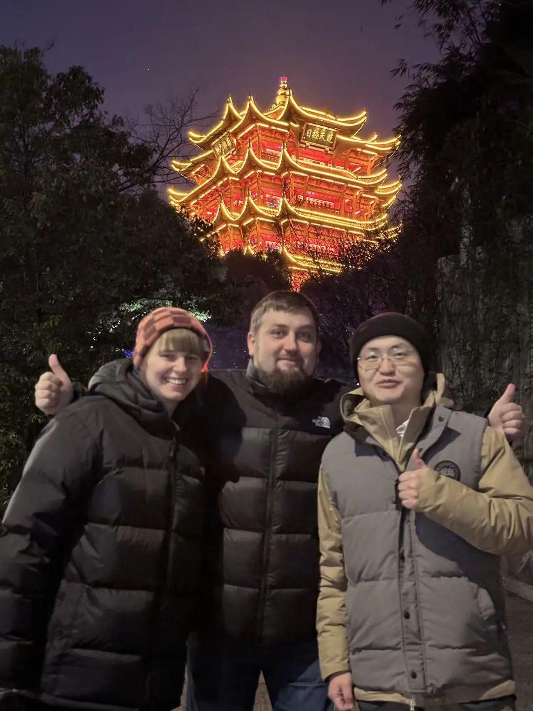 奥乌什拉(左一)、罗卡斯(左二)、张静宇(右一)与黄鹤楼合影