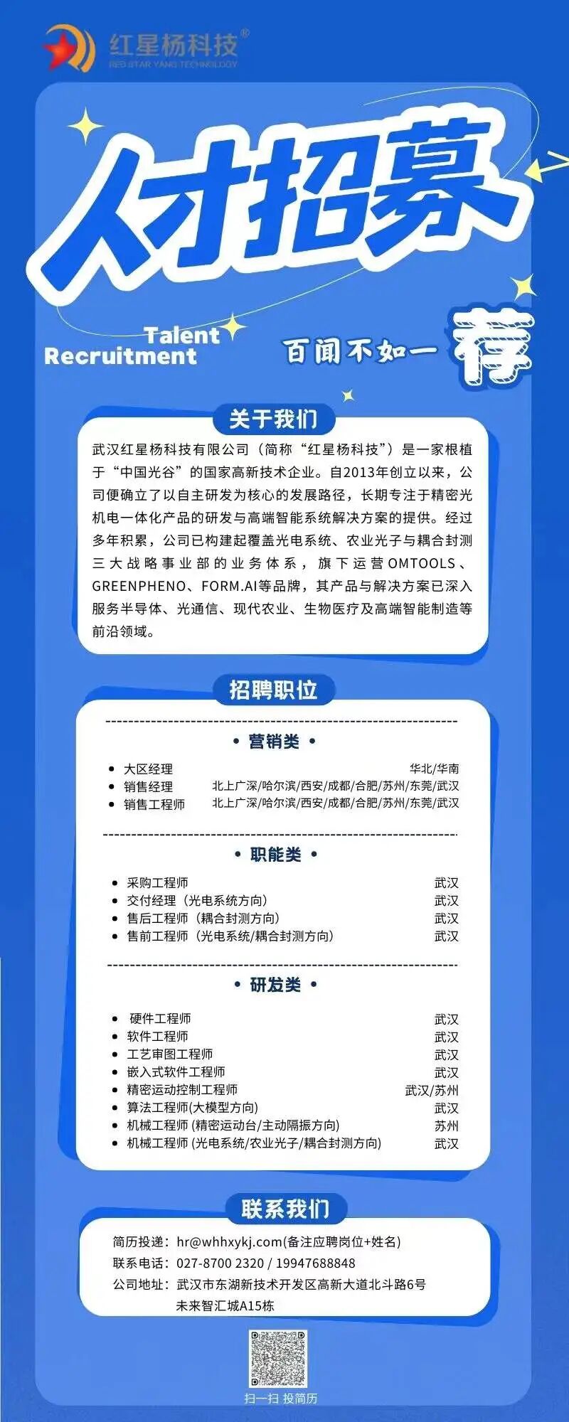 武汉红星杨科技有限公司以自主研发为核心的发展路径,专注于精密光机电一体化产品的研发与高端智能系统解决方案的提供。公司已构建起覆盖光电系统、农业光子与耦合封测三大战略事业部的业务体系,旗下运营OMTOOLS、GREENPHENO、FORM.AI等品牌,其产品与解决方案已深入服务半导体、光通信、现代农业、生物医疗及高端智能制造等前沿领域。