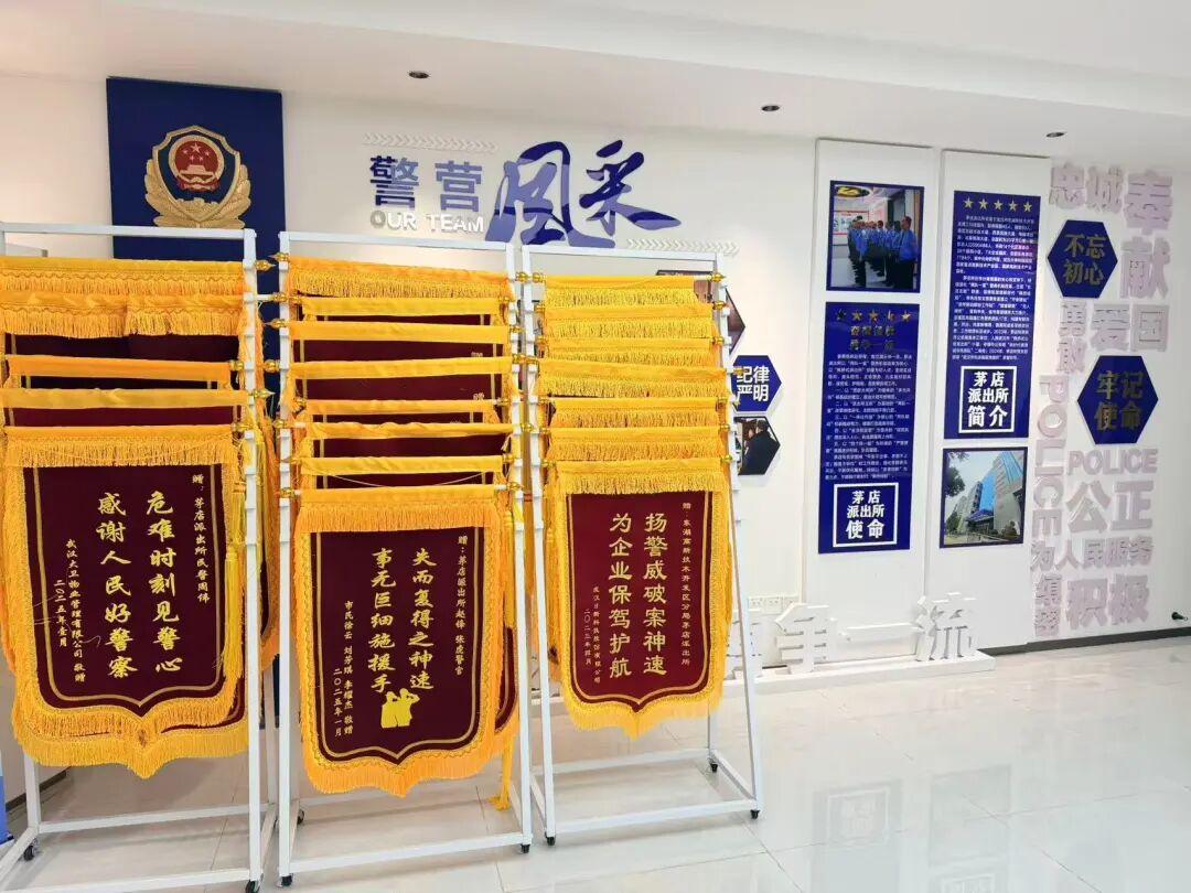 走进茅店派出所荣誉室,一排排的锦旗让人挪不开眼:“为民解忧护平安”“警企联动保建设”“666,我相信人民警察!”……
