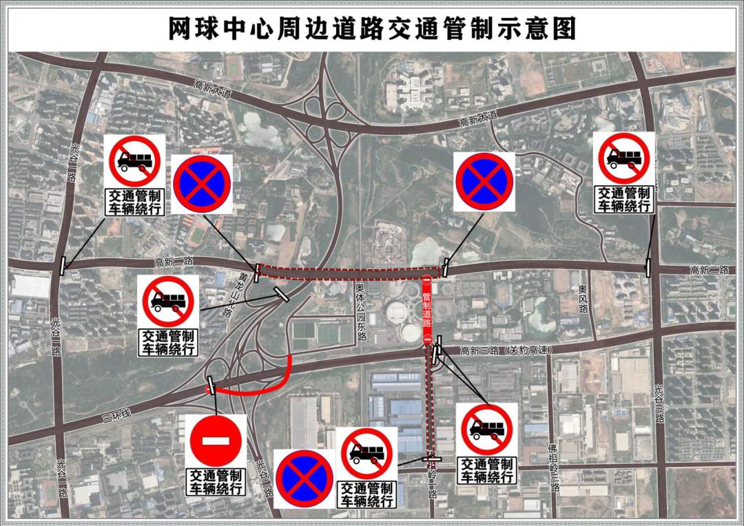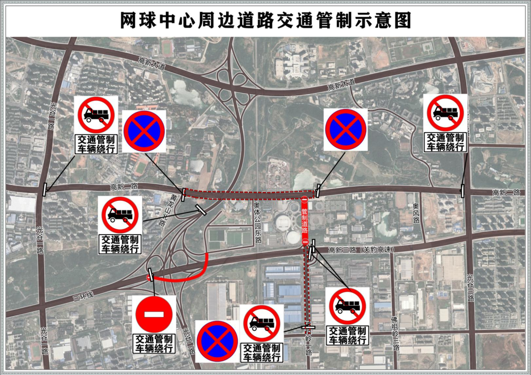 (1)佛祖岭一路(高新二路至关豹高速互通)禁止车辆通行和停放。(2)关豹高速佛祖岭一路立交往网球中心匝道采取临时交通管控措施,禁止车辆通行。(3)三环线(光谷大道立交至新武黄立交)高新二路出口匝道采取临时交通管控措施,禁止车辆通行。(4)高新二路(黄龙山北路至佛祖岭一路)禁止车辆停放。(5)高新二路(黄龙山北路至光谷三路)路段禁止货车通行。