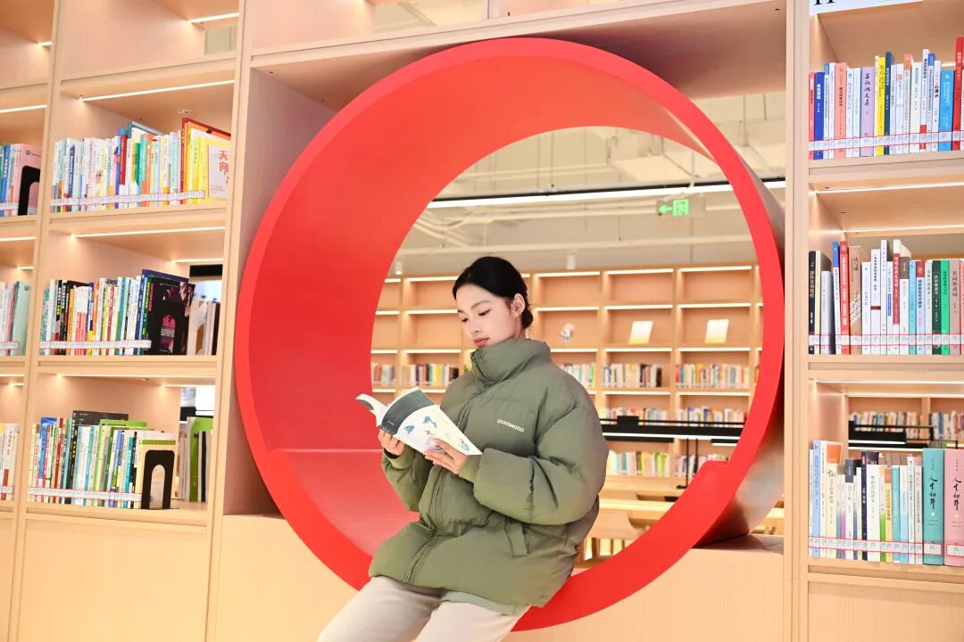 这是首个与交通枢纽融合的光谷书房。步入其中,轨道交通元素随处可见。例如,部分书架设有红色圆形窗口,灵感来源于地铁隧道,让阅读空间有了流动的韵律。