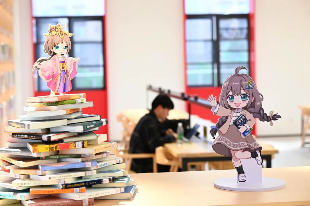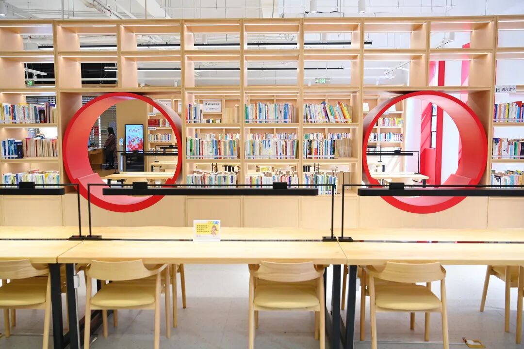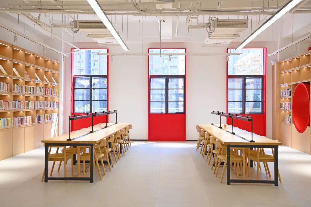 分馆整体配色清新明快,桌椅、书架以原木色为主,窗户区域用红色点缀,落地玻璃窗引入自然光,与暖调灯光交相辉映,营造温馨阅读氛围。