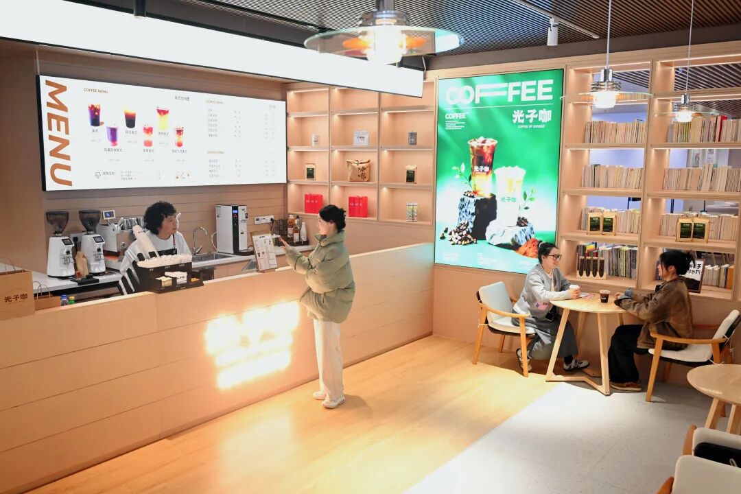 往里走,分馆内还藏着一处独立咖啡休闲区“光子咖”。穿过咖啡区,推门就是230平方米户外露台。读者可以端一杯咖啡走到露台远眺,品味书香与醇香交织。