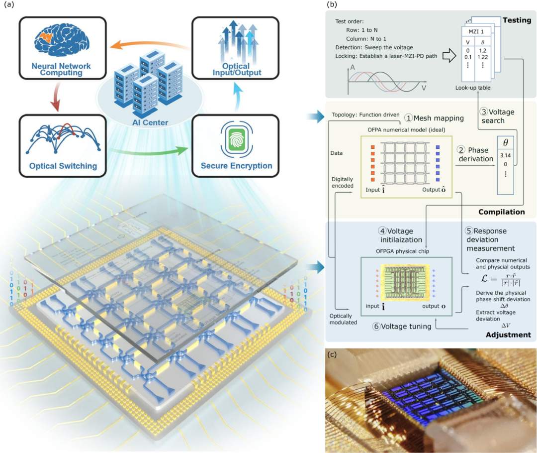 该系统由可编程光子芯片、电子控制模块和测试-编译-调节(TCA)智能配置框架组成,可实现光子计算加速、信号处理、网络交换和安全加密等多种功能。相关成果发表于Nature子刊Light: Science&Applications 15:165。