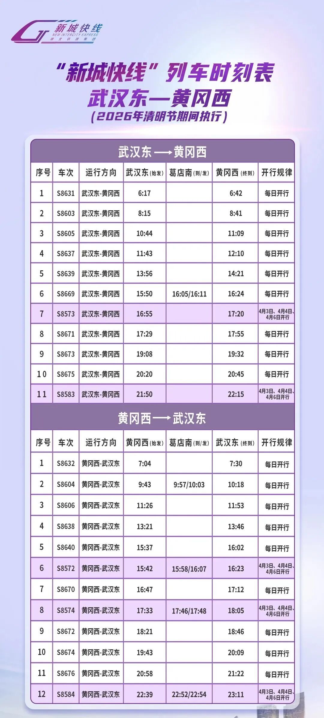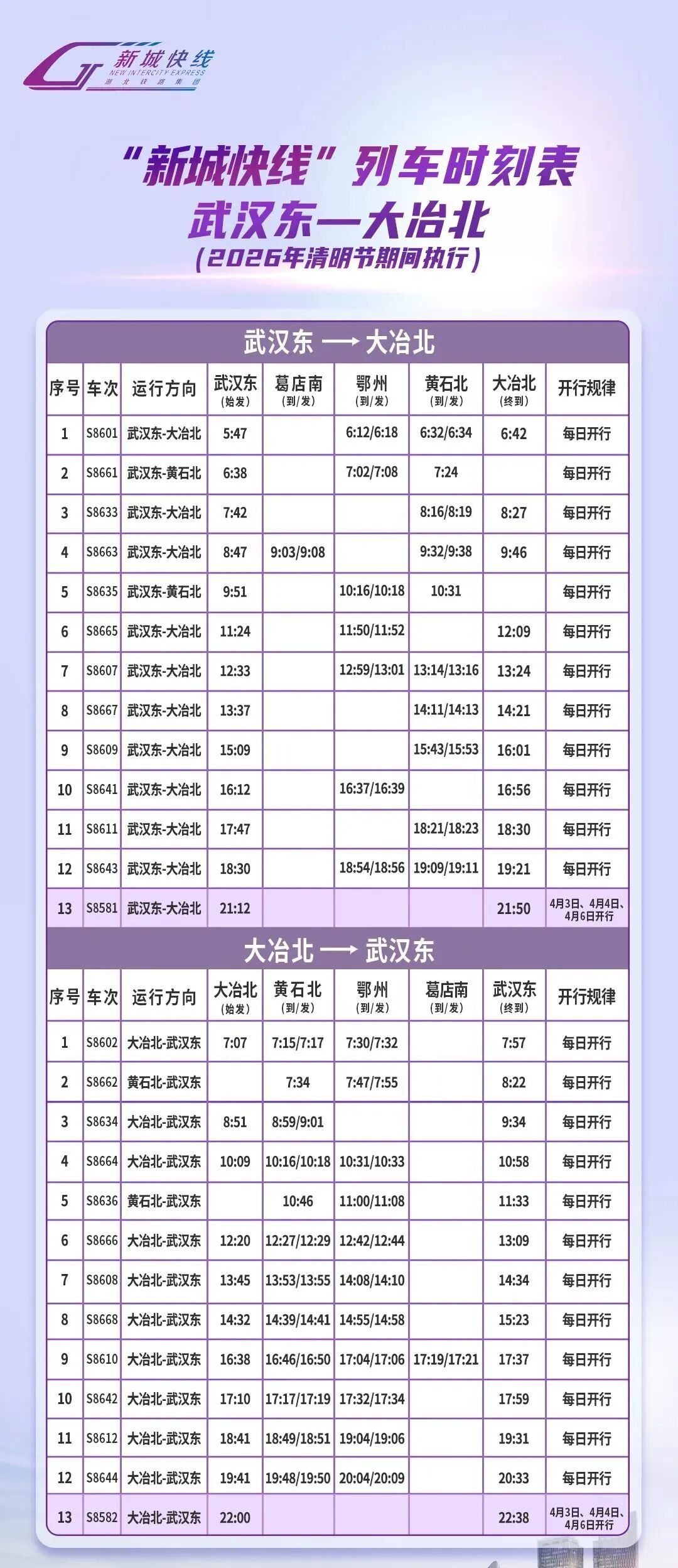 根据武汉局集团公司最新通知,4月3日、4月4日和4月6日, “新城快线”将按49列/日开行,新增假日临时列车7列/日,其中武汉东至大冶北方向1列,大冶北至武汉东方向1列;武汉东至黄冈西方向2列,黄冈西至武汉东方向3列。具体列车开行时刻表如下: