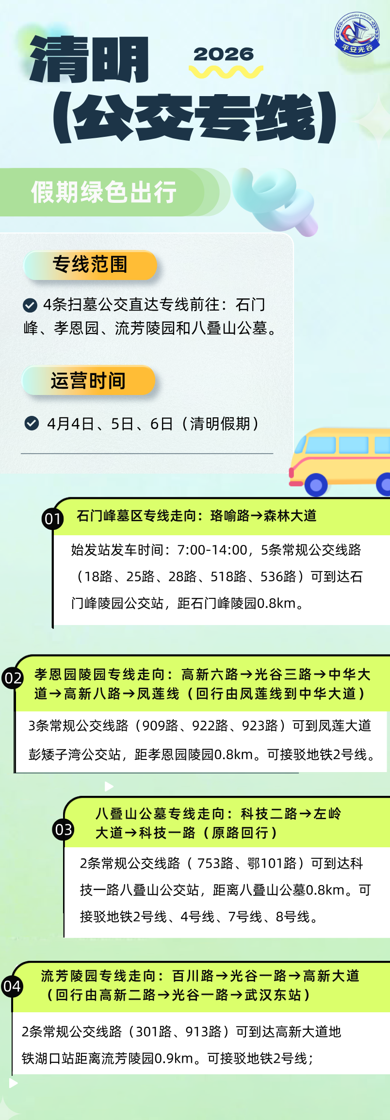 清明将至,光谷辖区五大墓区部分路段实行交通管制。为方便市民绿色出行、错峰祭扫,4月4-6日,光谷开通4条扫墓公交、13条专线如下: