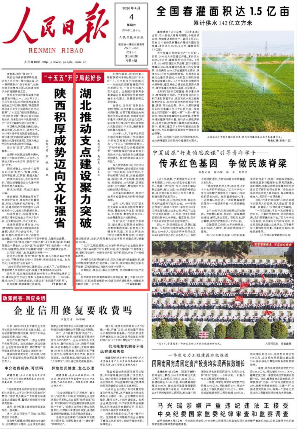 4月4日,《人民日报》头版头条报道湖北,在“‘十五五’开好局起好步”专栏刊发文章《湖北推动支点建设聚力突破》,聚焦湖北以改革创新激活力,努力打造具有全国影响力的科技创新高地。以下为全文转载。