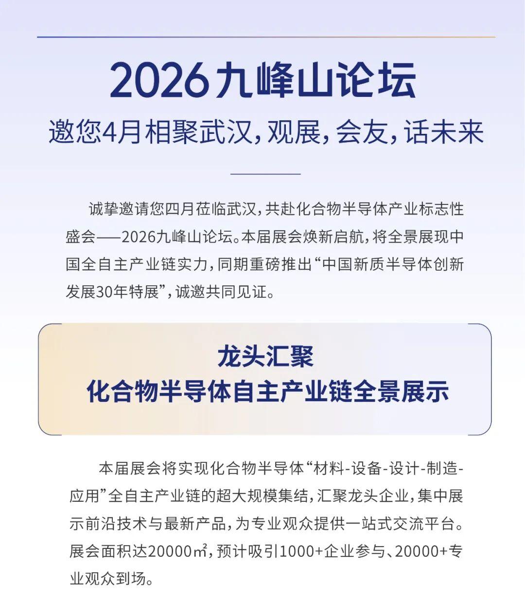 一年一度的国内化合物半导体领域标杆性产业盛会——2026九峰山论坛将于4月23日至25日在中国光谷科技会展中心举办。本届论坛以“新赛道、新技术、新产品、新市场”为主题,展览面积达20000平方米,预计将汇聚超1000家参与企业、数万名专业观众,打造一场规模盛大、规格顶尖、影响卓著的新质半导体年度嘉年华。