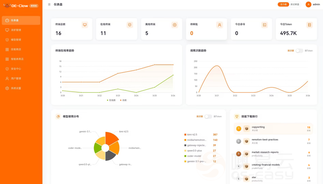 针对企业普遍关心的算力成本问题,OE-Claw提供可视化仪表盘,实时监控Token用量、使用趋势及模型分布,管理员可按终端或用户精准配置配额,实现AI算力全流程透明化管控。平台还内置“技能商店”和“智能体商店”,企业可将内部沉淀的代码规范、测试脚本等私域技能上传共享,高校教师可构建校本智能体生态,实现能力高效复用。