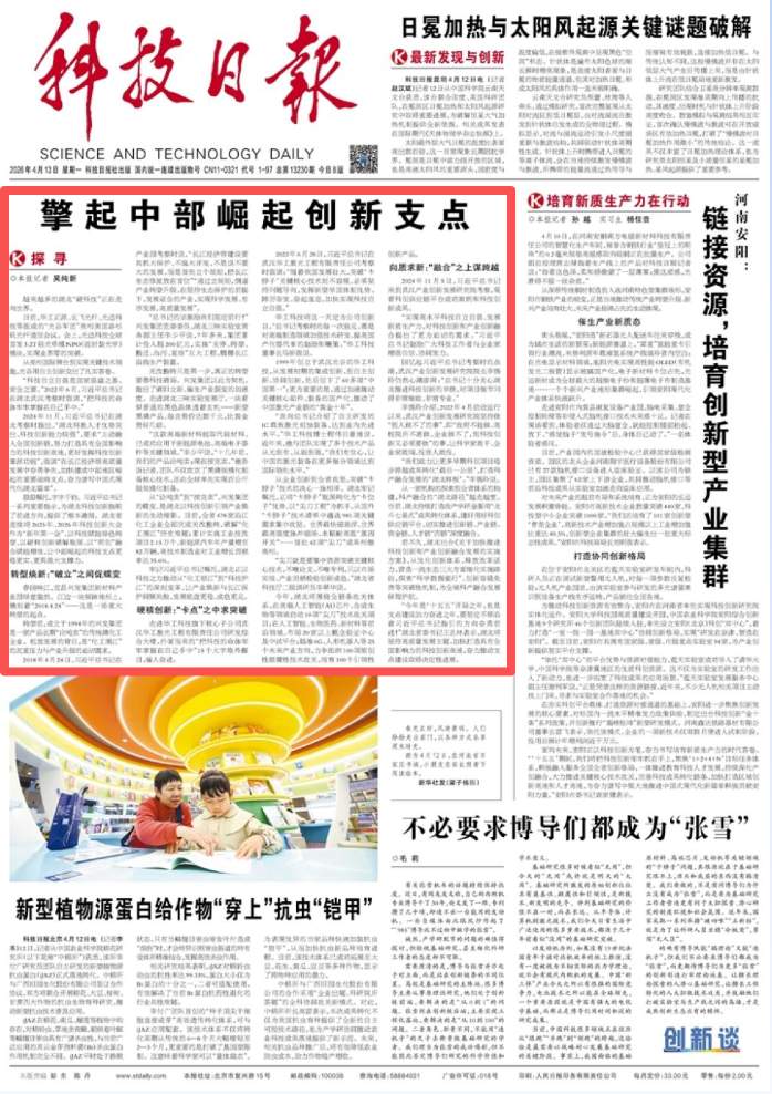 4月13日,《科技日报》头版头条刊发报道《擎起中部崛起创新支点》,以下为全文转载。