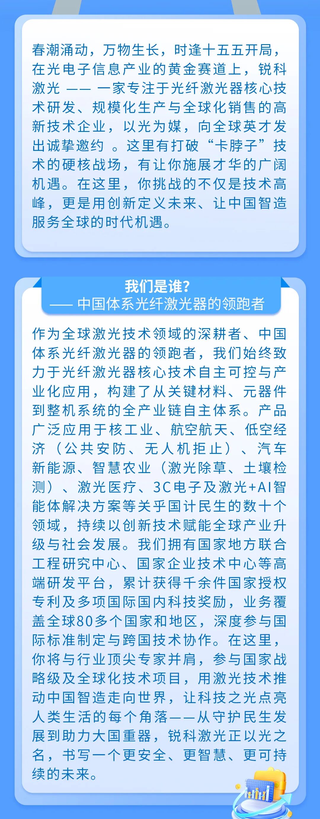 武汉锐科光纤激光技术股份有限公司是一家专业从事光纤激光器及其关键器件与材料的研发、生产和销售的国家火炬计划重点高新技术企业,拥有高功率光纤激光器国家重点领域创新团队和光纤激光器技术国家地方联合工程研究中心。